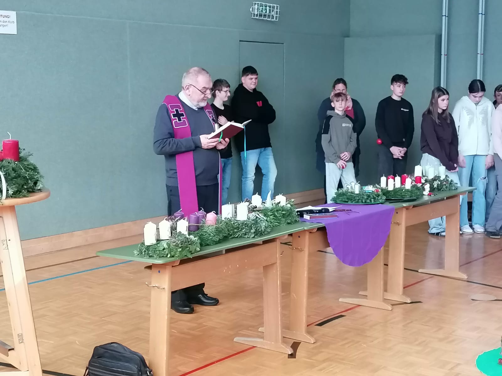 Mit einer stimmungsvollen Advenkranzweihe im Turnsaal starteten wir besinnlich in die Adventzeit. Der Pfarrer segnete die Adventkränze, die uns auf das kommende Weihnachtsfest einstimmen.