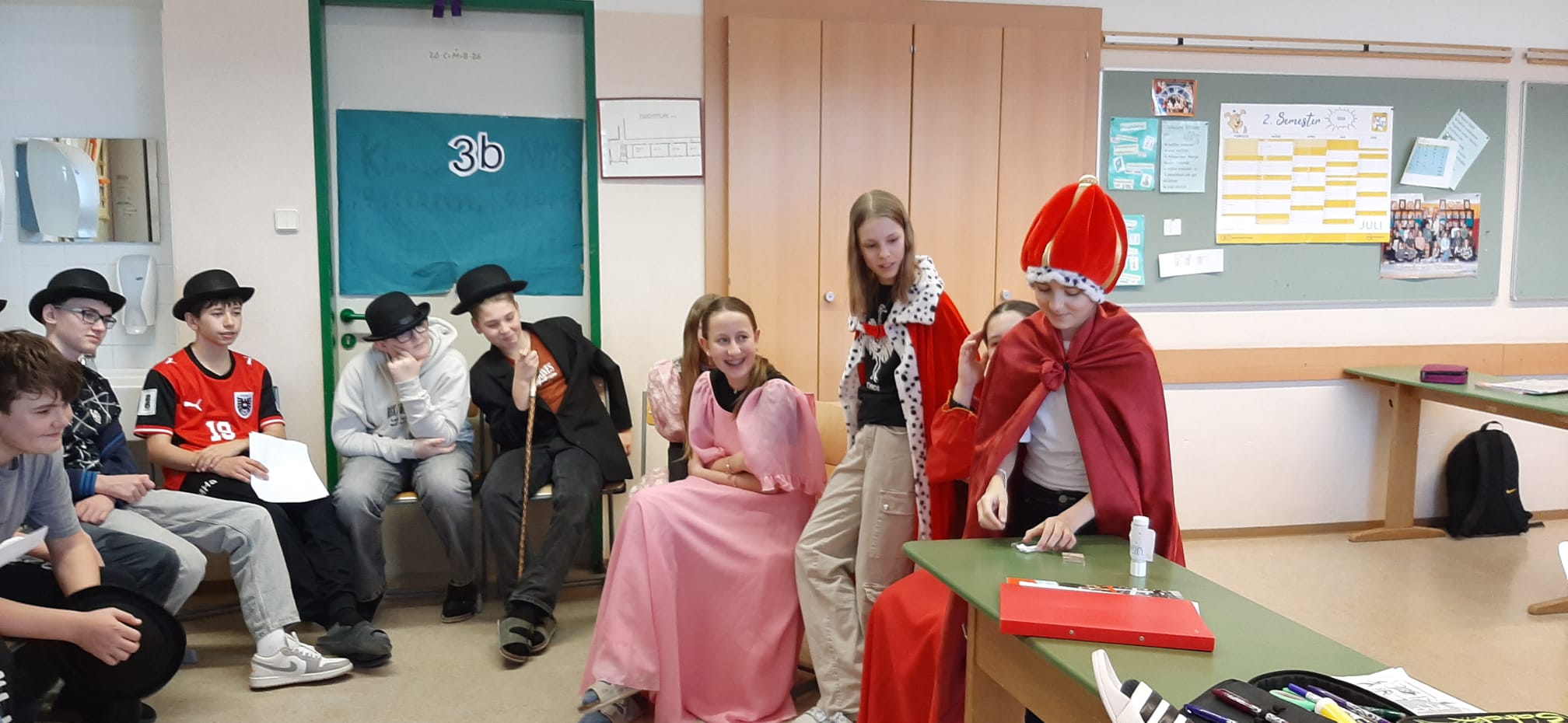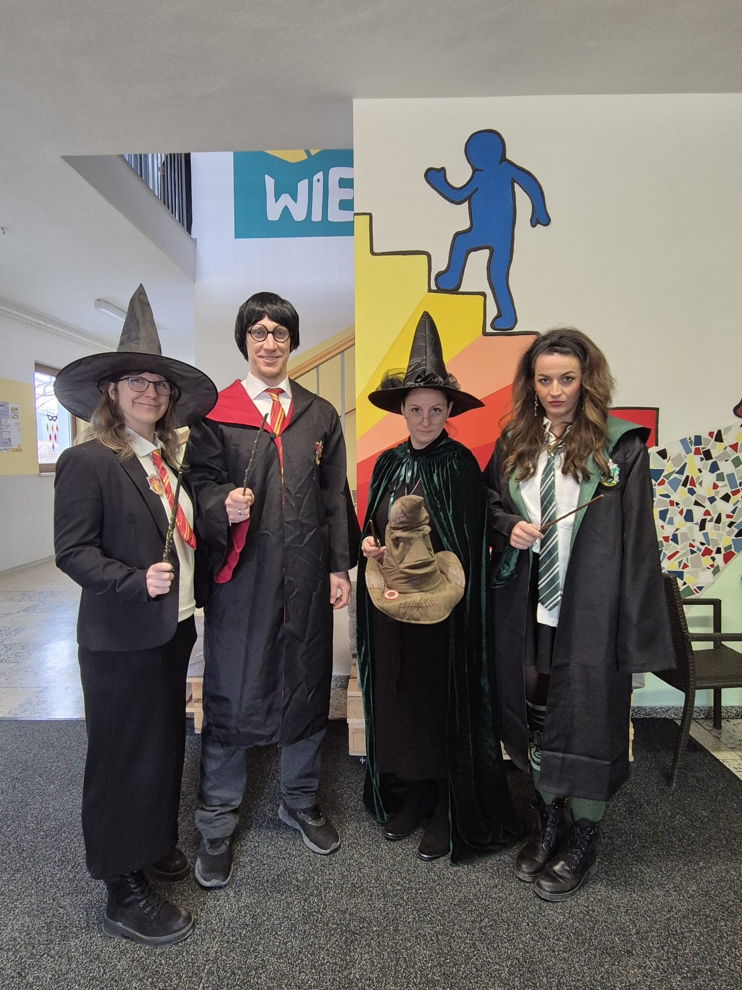 Wenn M&Ms durch die Schulgänge rollen und Piraten im Klassenzimmer sitzen, dann ist der Faschingswahnsinn an der MS Wiesmath ausgebrochen. Überall schillernde Kostüme, fröhliches Lachen und eine ordentliche Portion Spaß - unsere Schule wurde zur kunterbunten Partyzone. In den Klassenräumen wurde gelacht, gespielt und natürlich köstliche Krapfen genascht. Auch das Lehrerteam machte mit: Während das Deutsch-Team direkt aus Hogwarts angereist kam, spazierten die Englisch-Lehrerinnen als Figuren aus dem Englischbuch durchs Schulhaus.