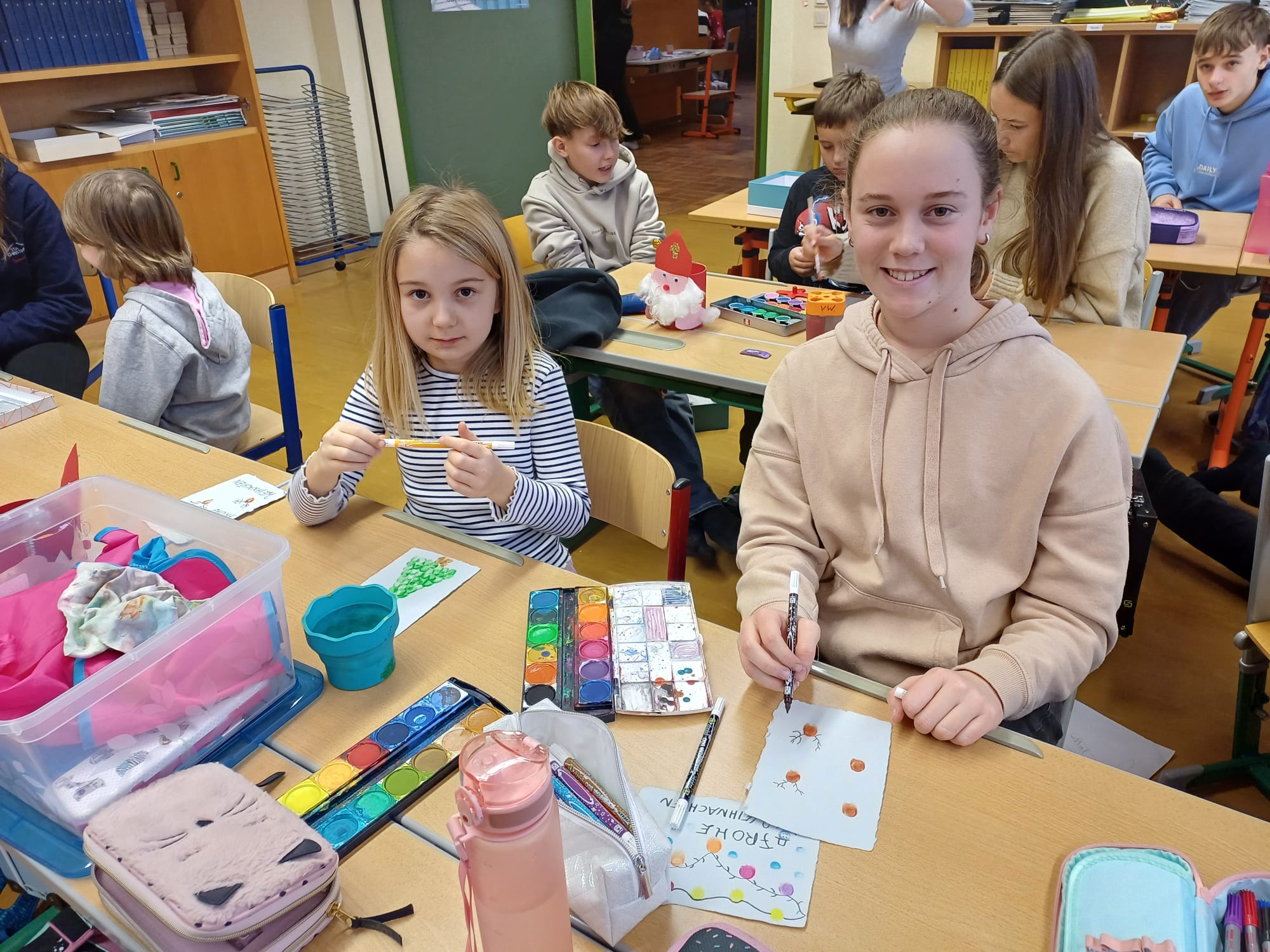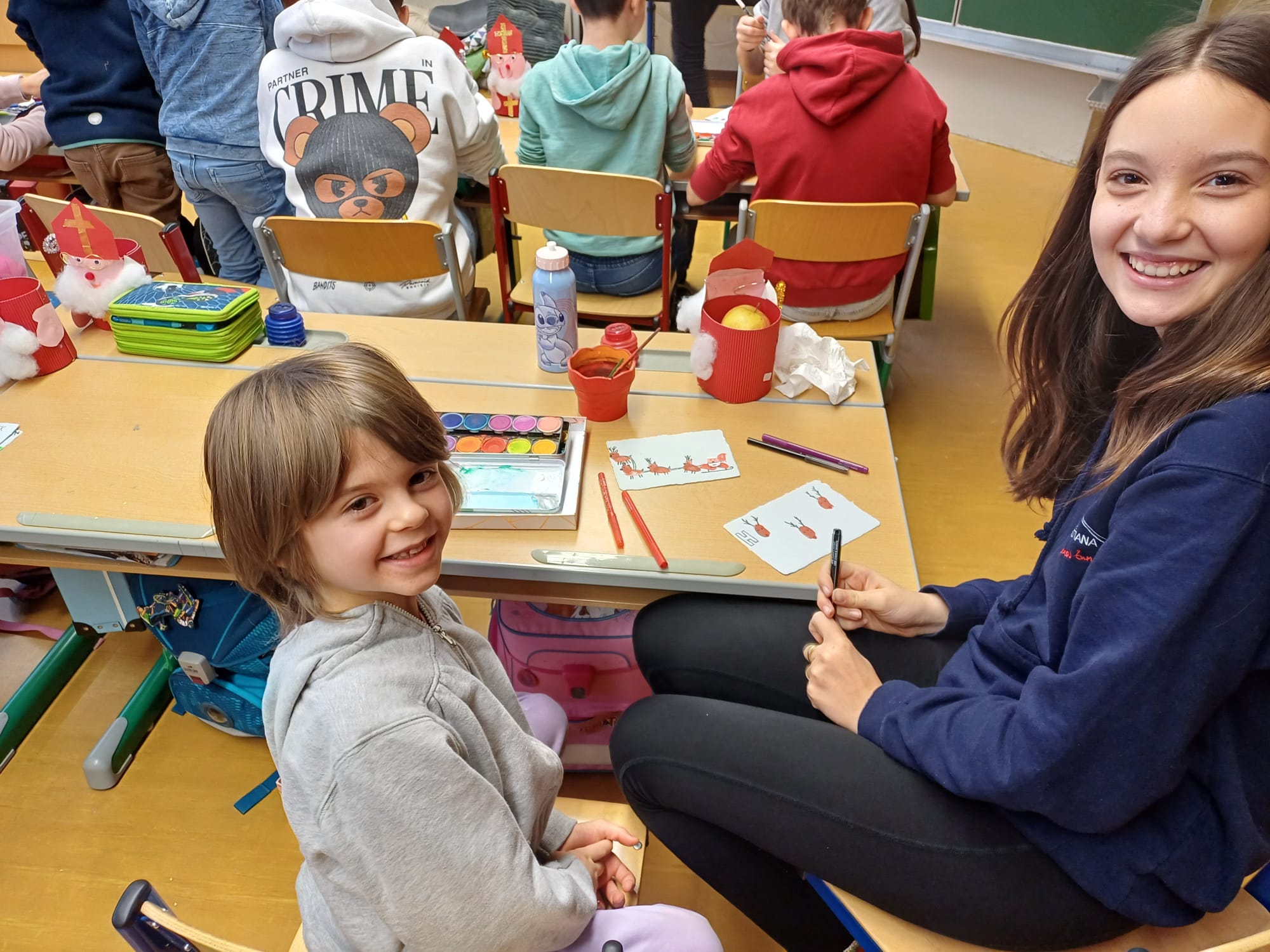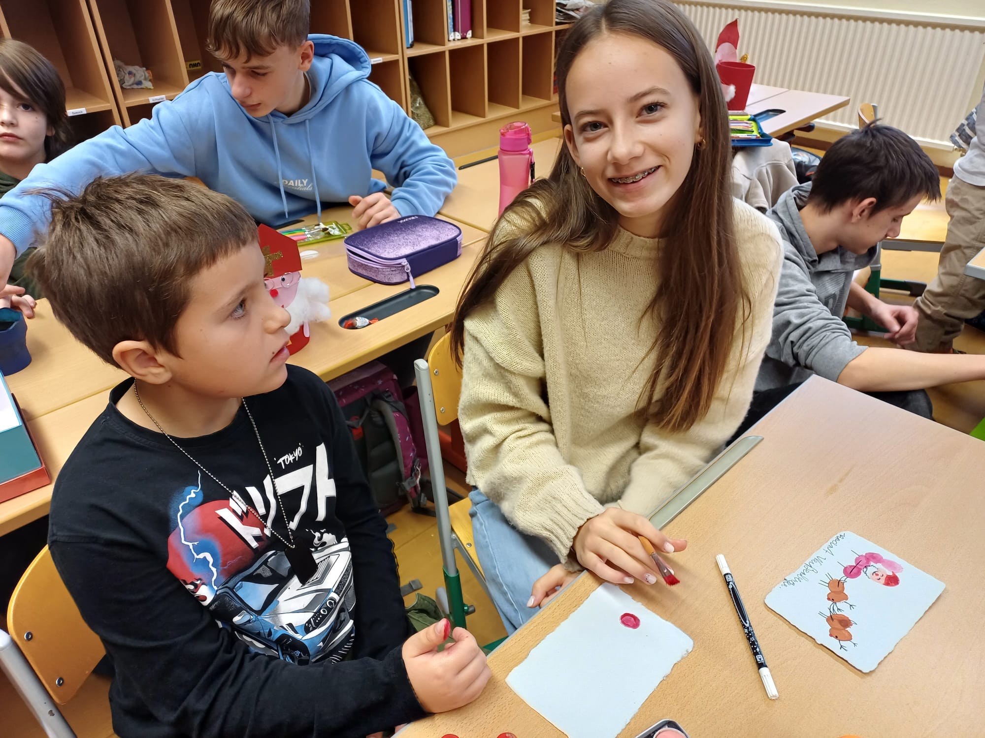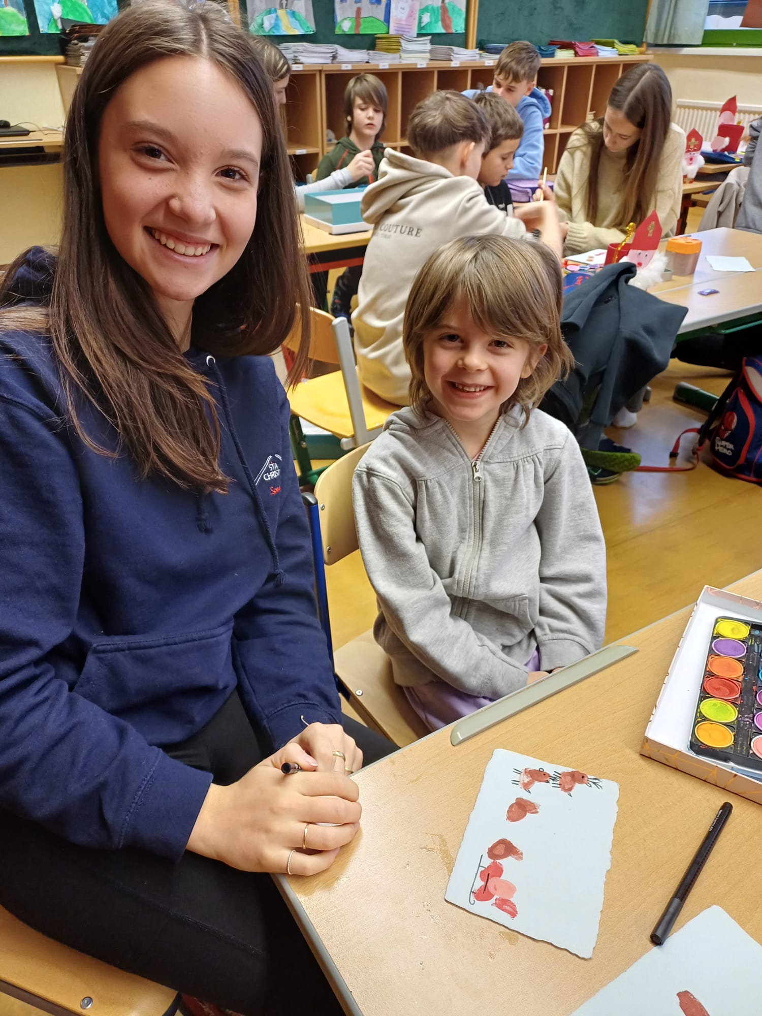 In der Adventzeit gestalteten Firmlinge und Erstkommunionskinder gemeinsam kreative Weihnachtskarten. Die Schüler und Schülerinnen der Mittelschule besuchten hierfür die 2. Klasse der Volksschule - ein schönes Miteinander zwischen Groß und Klein.
